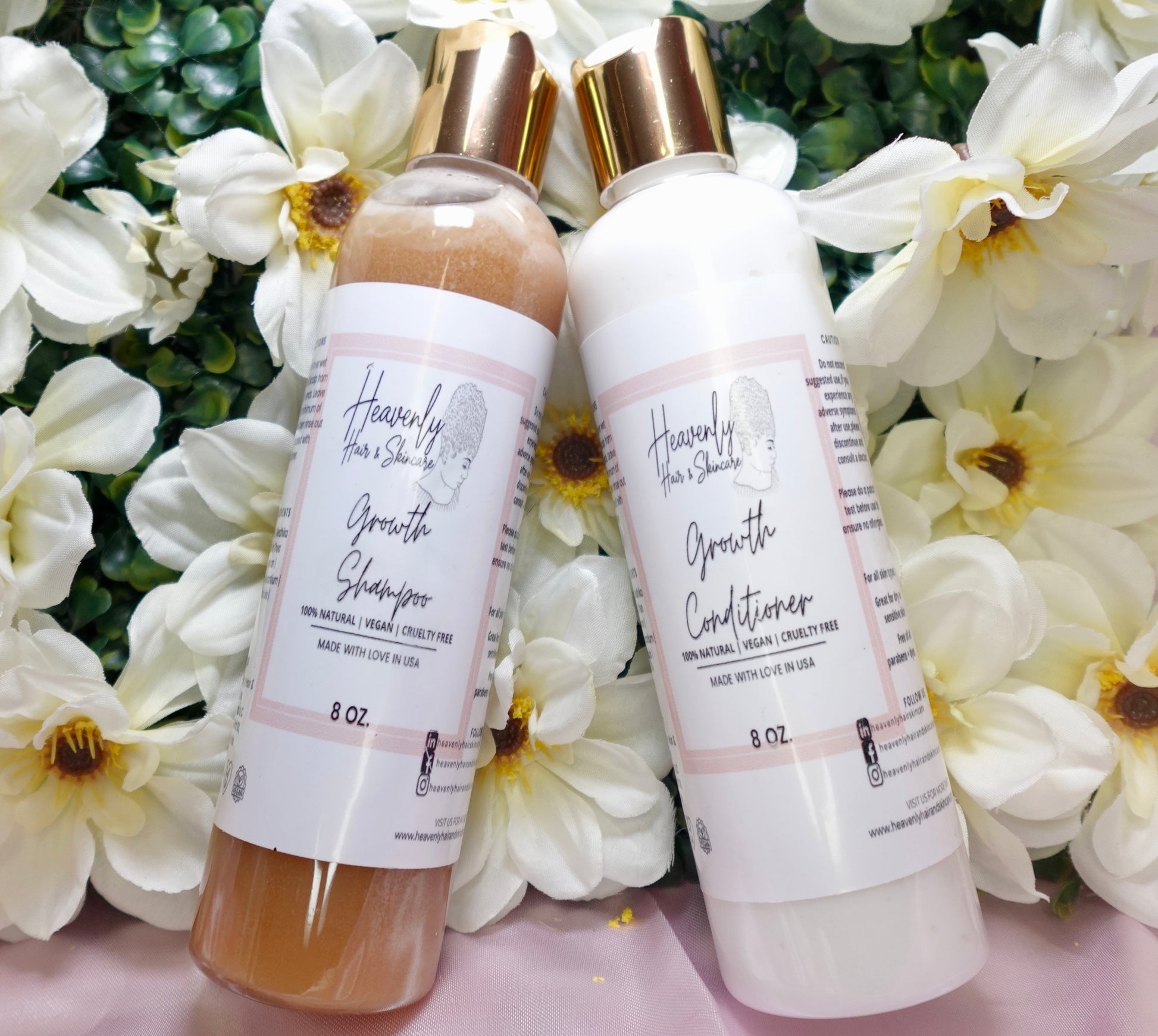 Heavenly's Stimulating Shampoo & Leave In Conditioner are filled with multiple auyervedic herbs that stimulate the follicles and increases blood flow to the scalp. It is also filled with moisturizing and conditioning liquids that moisturizes and softens dry, brittle hair strands. The shampoo can be left in the hair for 15 minutes in order for the ingredients to penetrate on the scalp and strands. The Conditioner can be washed out after 15 minutes or left on hair, until next wash day. All ingredients are natural, organic and are safe for all hair types.