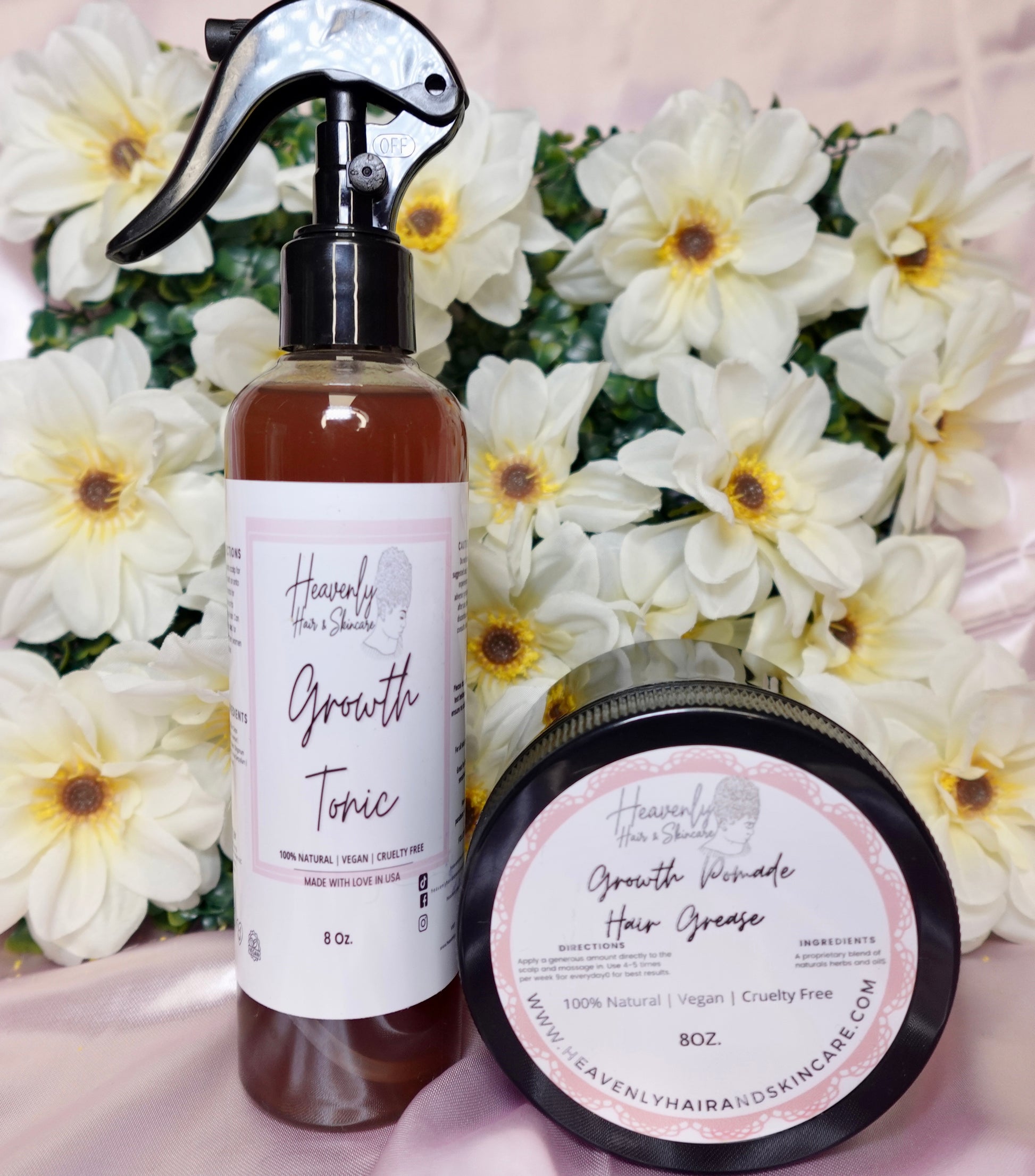 The Growth and Strength Duo is the Growth Tonic and the Growth Pomade/Grease in which the spray is full of Ayuervedic herbs that stimulate the follicles, while the Pomade pushes the blood flow to the scalp even faster and it doesn't clog the pores.